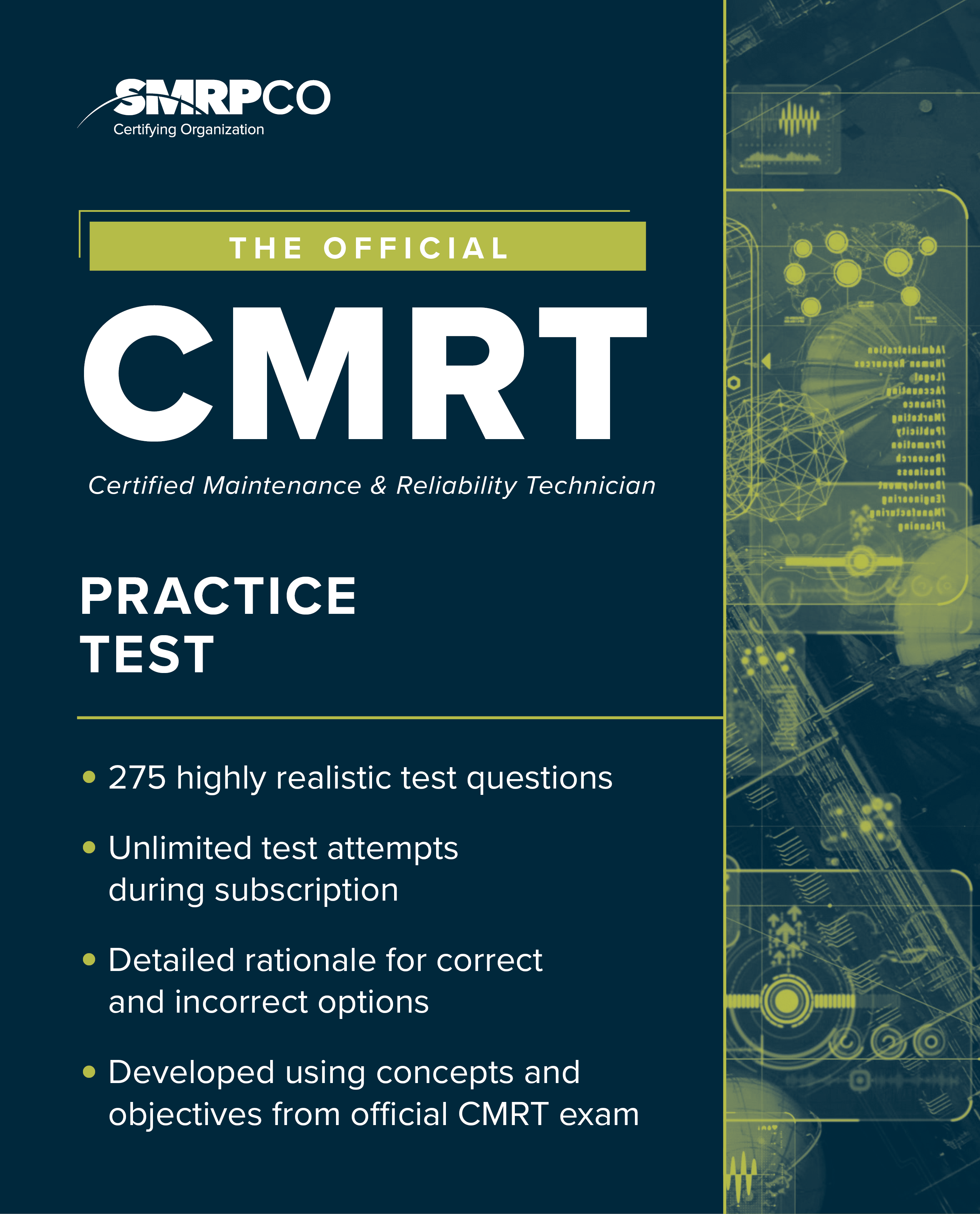 • The CMRT certification assesses the proficiency of those responsible for preventative, predictive and corrective maintenance – multi-skilled individuals who play a critical role in the success of organizations worldwide.